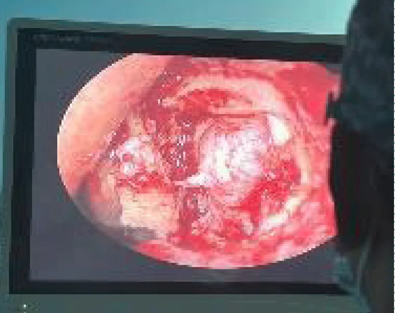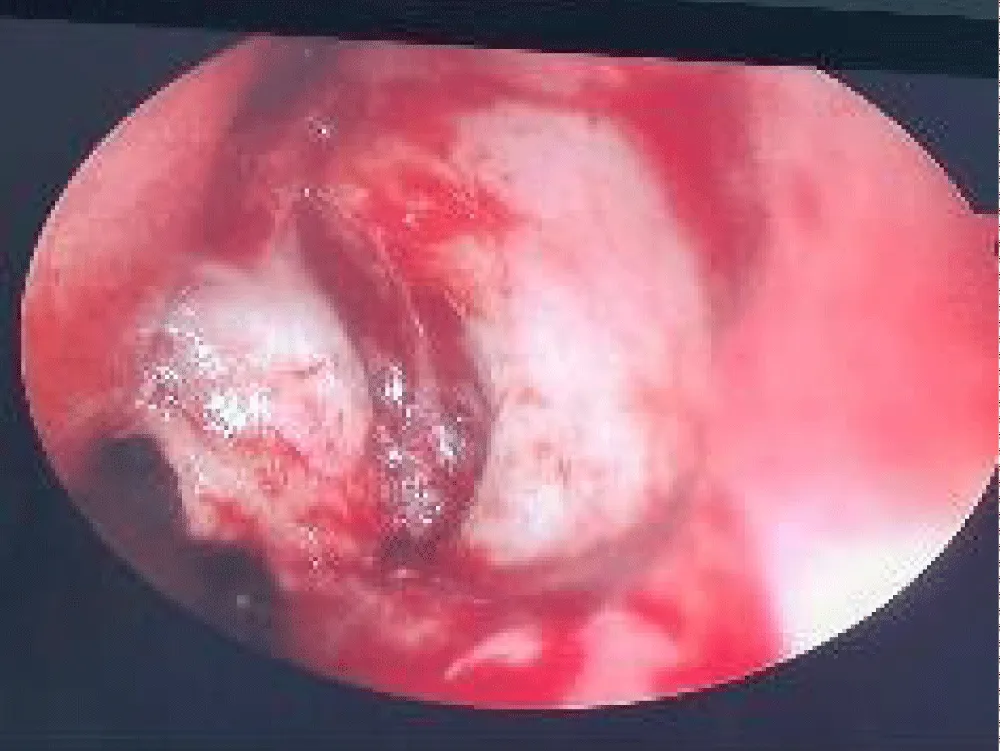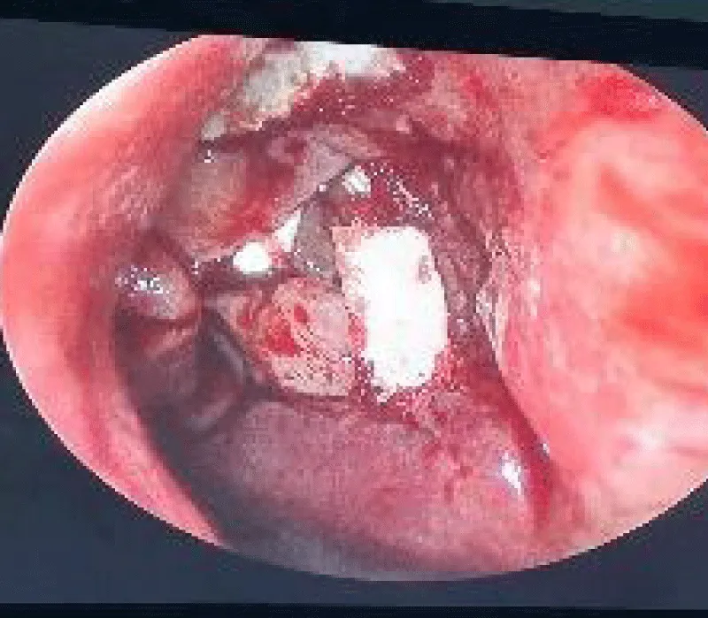 Figure 4: Opening of NLD with scalpel blade 12, creation of anterior and posterior flaps and marsupialization completed with gelfoam support on flaps and repositioning of initial flaps to cover the raw bones.