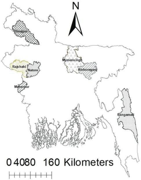 Figure 1: Study sites: showing six districts in different parts of Bangladesh.