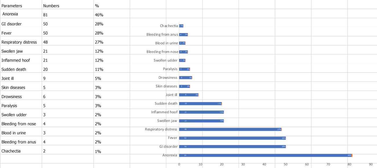 During our studies, 85% respondents reported different signs of illness among their pigs. 46% reported anorexia, 28% reported gastrointestinal disorders, 28% reported fever, 27% reported respiratory distress, 12% reported swollen jaw, 12% reported inflamed hoof, 11% reported sudden death and 5% reported joint ill (Figure 2). We found that 29% pig raisers had goats, 29% had chickens, 22% had cows, 7% had ducks and 6% had dogs (Figure 3).